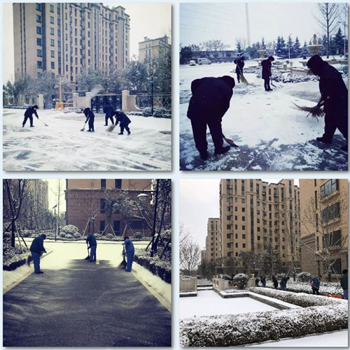 當(dāng)您吃過早餐暖暖出門的時(shí)候,當(dāng)您欣賞朋友圈里美麗雪景的時(shí)候,有一群人已經(jīng)默默來到了工作崗位上,他們?cè)诼祜w雪中忙碌,只為讓業(yè)主在雪天安全出行,防止因大雪路滑帶來的各種安全隱患。