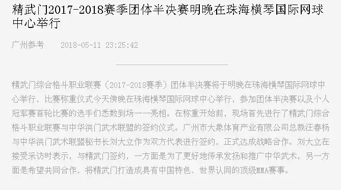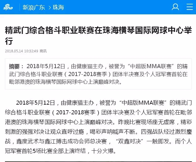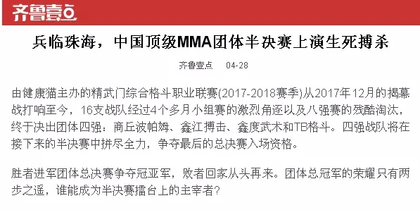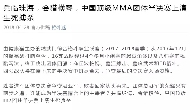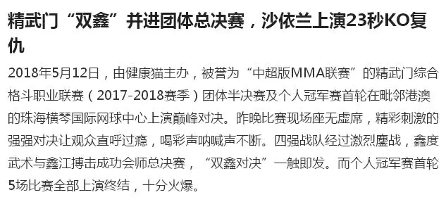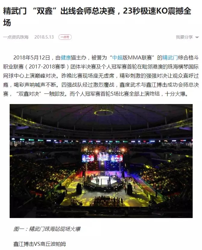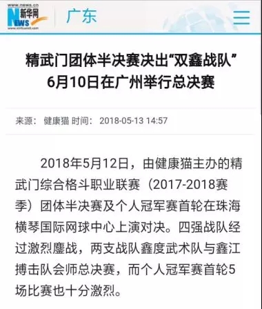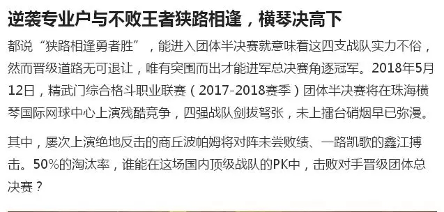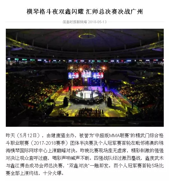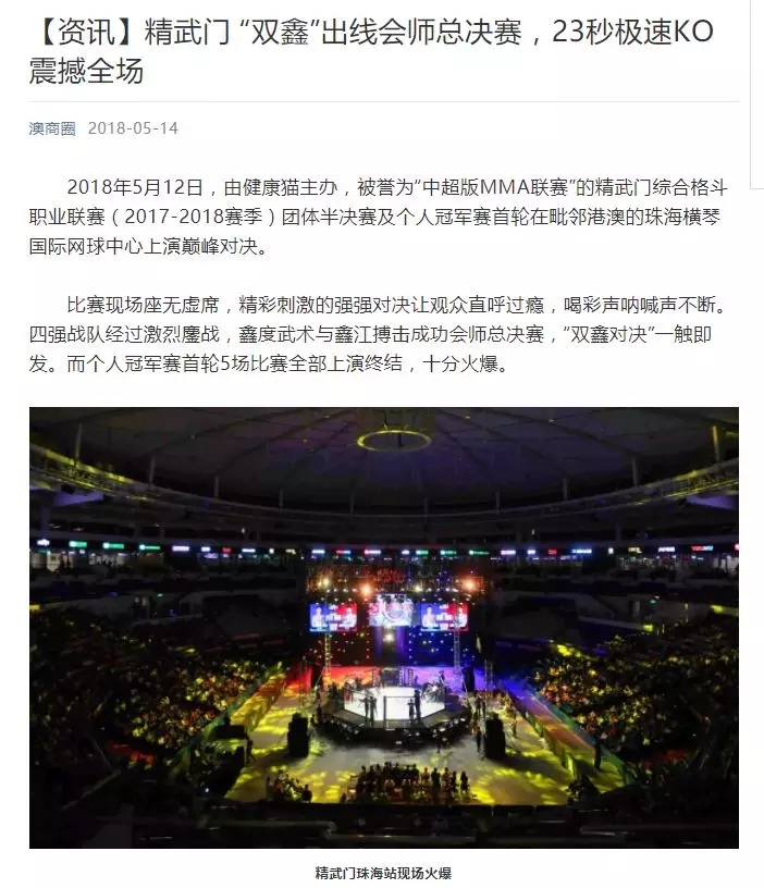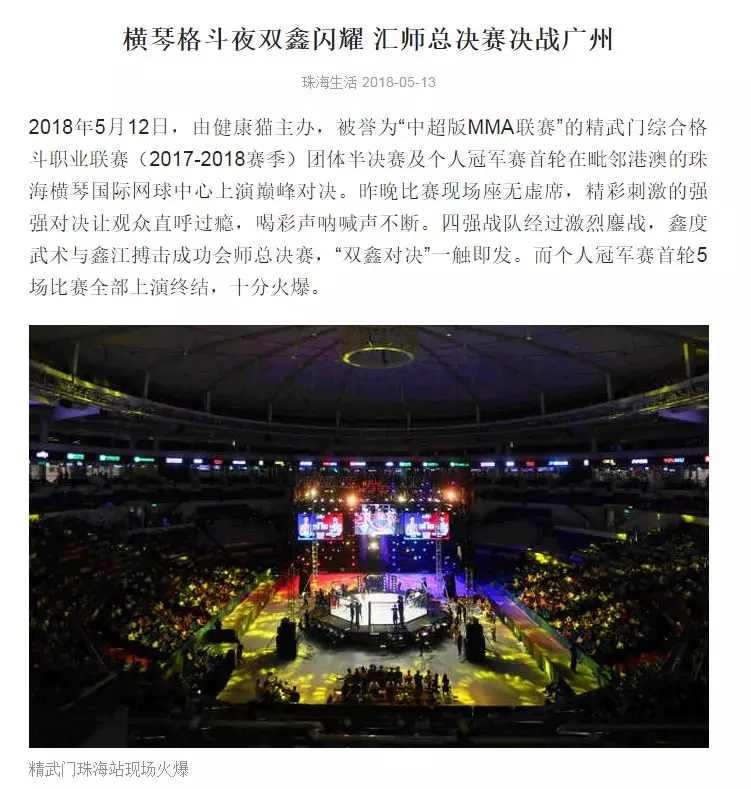 2018年5月12日,精武門(mén)綜合格斗職業(yè)聯(lián)賽(2017—2018賽季)團(tuán)體半決賽在珠海橫琴國(guó)際網(wǎng)球中心圓滿落幕。鑫江搏擊3:2險(xiǎn)勝商丘波帕姆,成功拿到團(tuán)體總決賽的入場(chǎng)券。