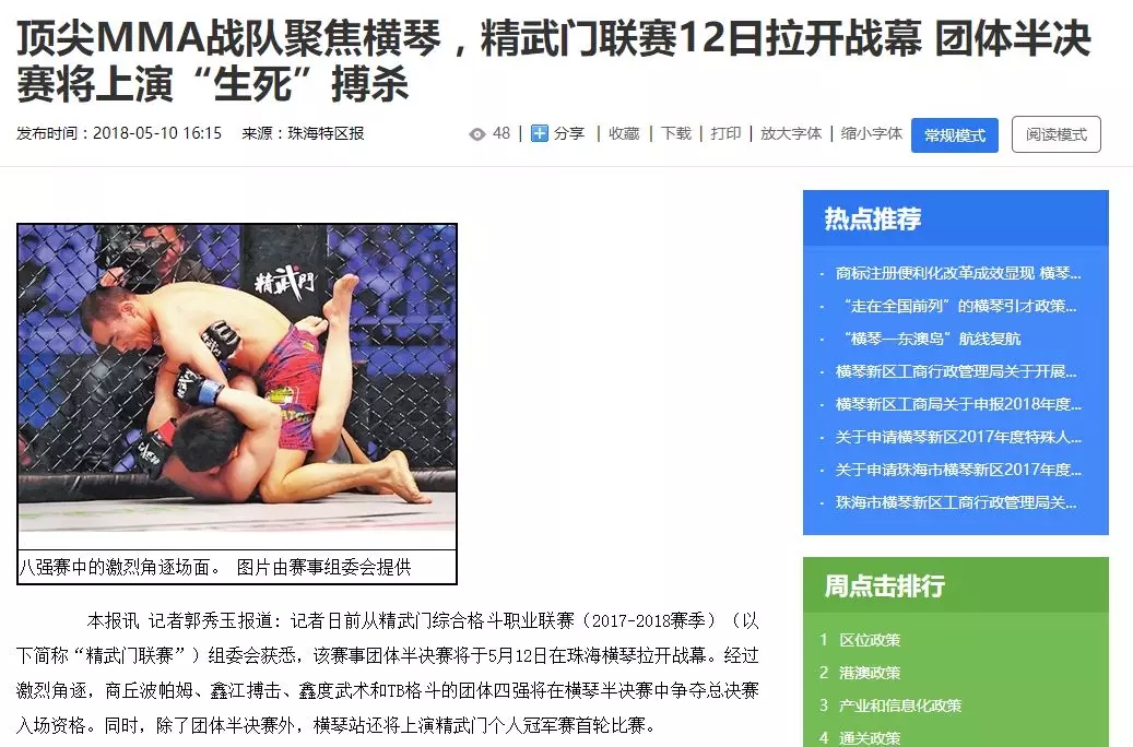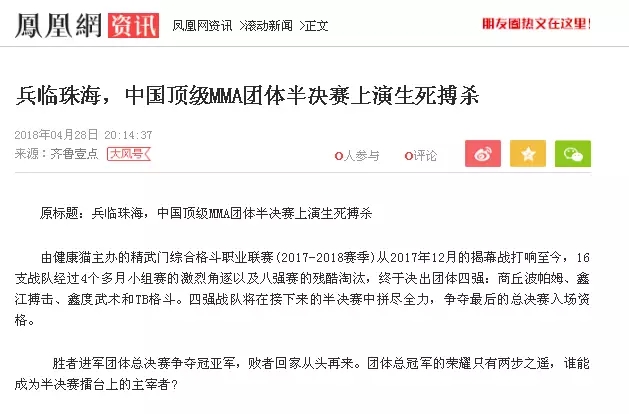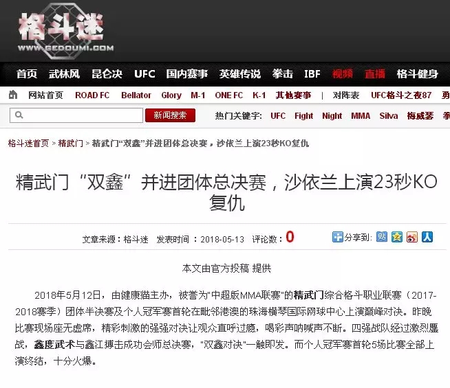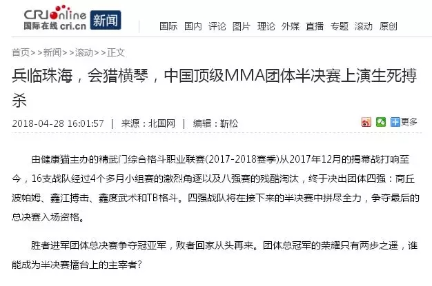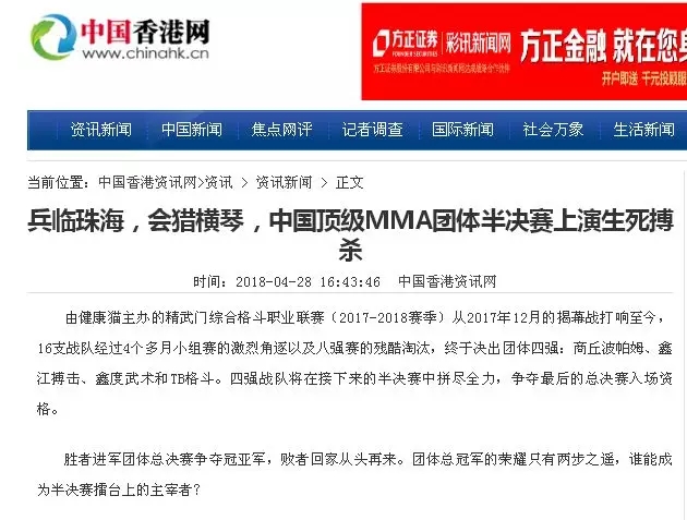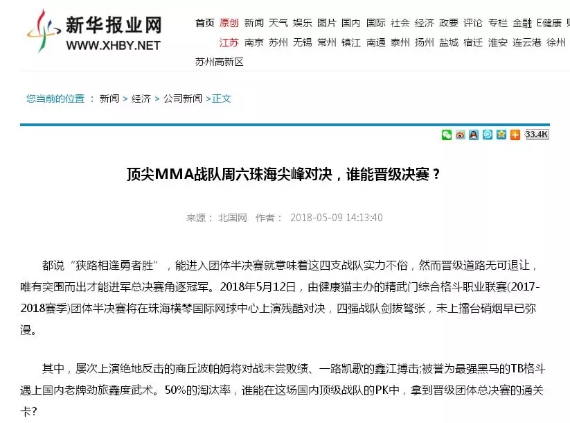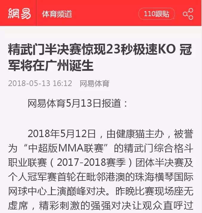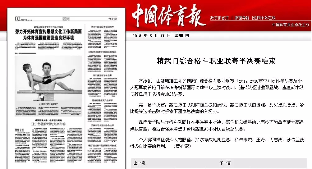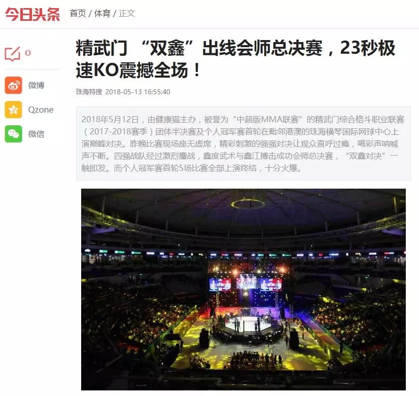 2018年5月12日,精武門(mén)綜合格斗職業(yè)聯(lián)賽(2017—2018賽季)團(tuán)體半決賽在珠海橫琴國(guó)際網(wǎng)球中心圓滿落幕。鑫江搏擊3:2險(xiǎn)勝商丘波帕姆,成功拿到團(tuán)體總決賽的入場(chǎng)券。