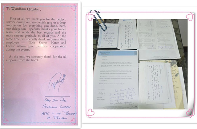 巴基斯坦總統(tǒng)馬姆努恩·侯賽因(Mr.Mamnoon Hussain)及貴賓一行對(duì)酒店的服務(wù)表示稱贊和滿意。峰會(huì)期間,酒店員工用心的服務(wù)收到了國(guó)內(nèi)外貴賓近40封表?yè)P(yáng)信,臨別之時(shí),馬姆努恩·侯賽因總統(tǒng)更是贈(zèng)送禮物,對(duì)酒店全體員工表示感謝。