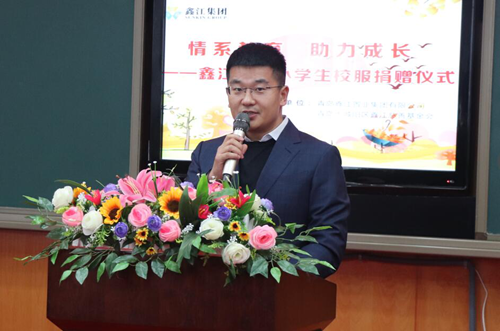 鑫江集團(tuán)副總經(jīng)理趙文博先生向小學(xué)生送上校服