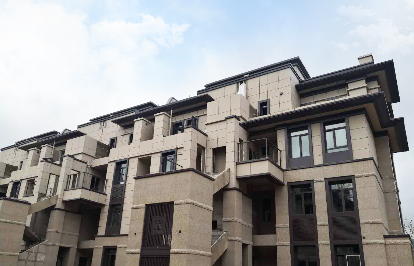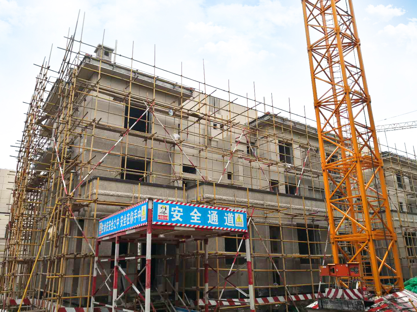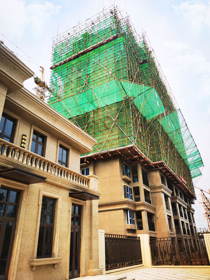 主體已封頂,二次結(jié)構(gòu)已完成,外墻抹灰完成,外墻保溫陸續(xù)展開施工,內(nèi)墻抹灰完成約50%,外墻干掛石材完成約50%,屋面工程完成約60%。