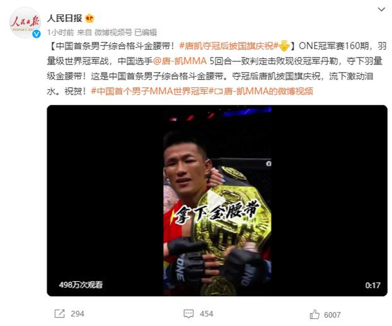在當?shù)?月26日的比賽中,唐凱憑借前幾回合擊倒對手以及給丹勒造成的腿部重創(chuàng)奪得羽量級世界冠軍!