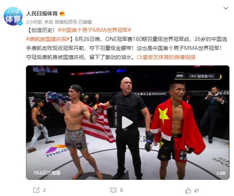 2022年8月26日,鑫江戰(zhàn)將唐凱在ONE羽量級世界冠軍斬獲金腰帶,為祖國再次爭光!
