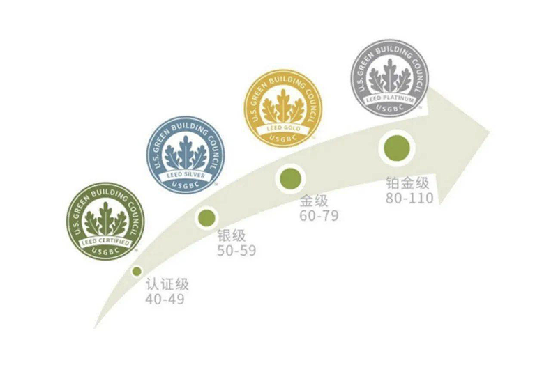 在目前世界各國的綠色建筑評估以及建筑可持續(xù)性評估標(biāo)準(zhǔn)中,LEED認(rèn)證評分體系被認(rèn)為是最完善、最有影響力的評估標(biāo)準(zhǔn)。就像一場綜合考試,在創(chuàng)新設(shè)計、選址與交通、可持續(xù)場地、用水效率、能源與大氣、材料與資源、室內(nèi)環(huán)境、地域優(yōu)先等八大方面對建筑物進(jìn)行考察評估,對超過69個小項(xiàng)進(jìn)行評估打分??偡?10分,分成:認(rèn)證級(40–49)、銀級(50–59)、金級(60–79)、鉑金級(80以上)四個等級。