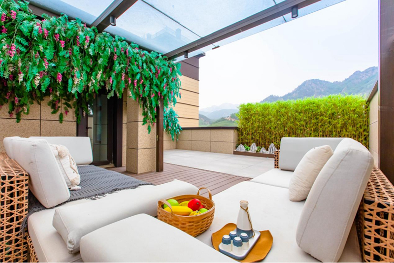 站在窗前,一幅潑墨山水畫清晰地映入眼簾。真正的推窗見山視角,眼前的青山如黛,云霧繚繞,附近更有太和山云頭崮、丹山、十梅庵等自然山景環(huán)抱。